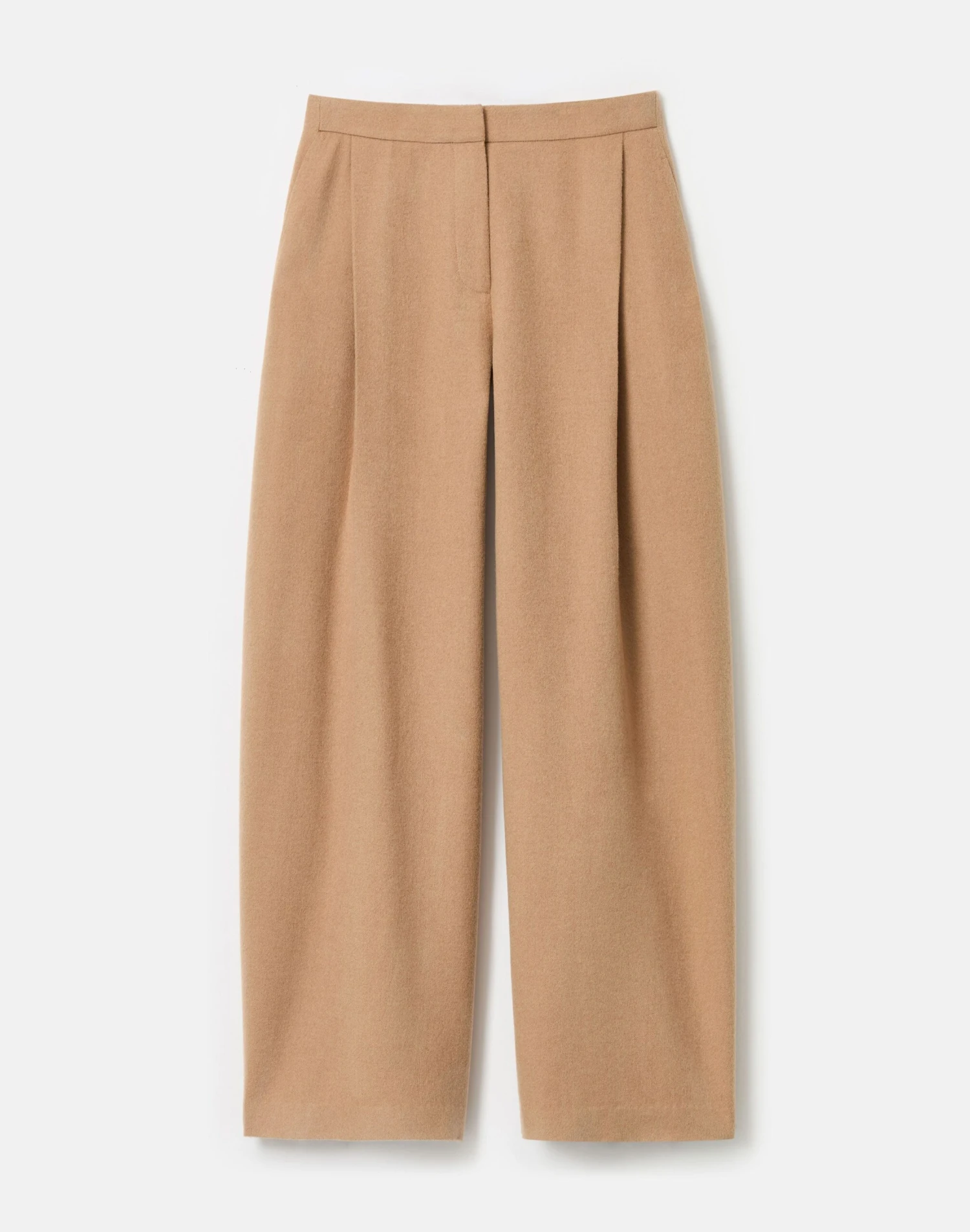 The mid-rise Cooper pant sits just below the natural waist, with front pleats and a full barrel leg that finishes at the ankle. This pair is tailored in signature camel hair—sourced from one of Italy’s most renowned textile mills and prized for its luxurious hand, natural softness and breathability.