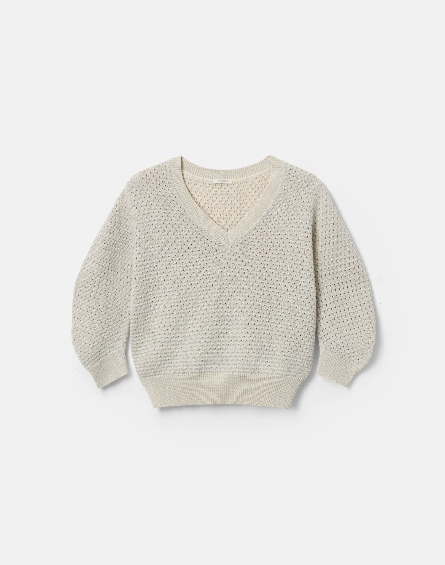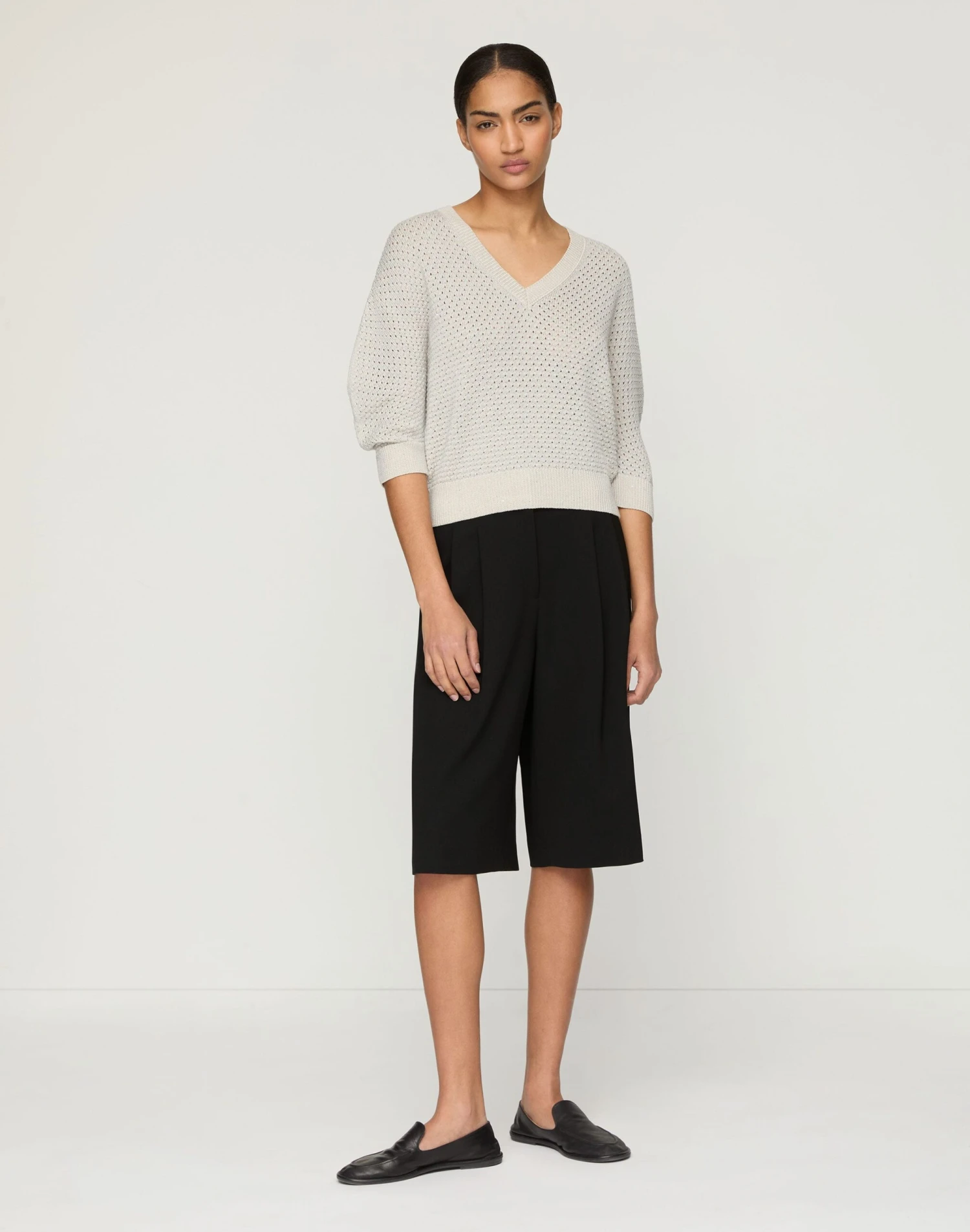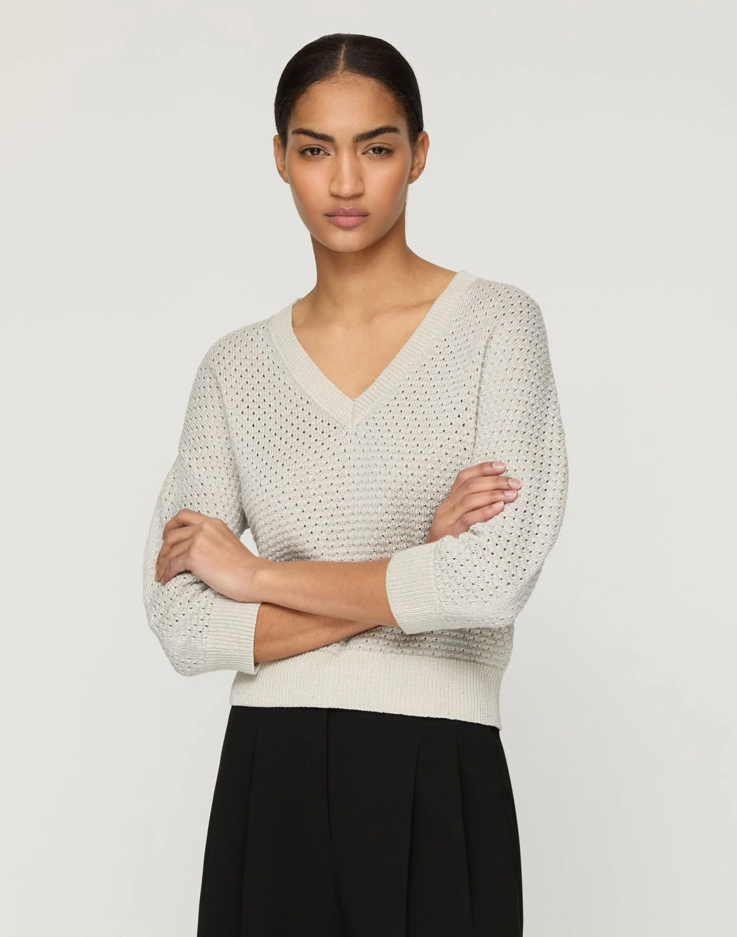 Embellished with glistening micro-sequins, this V-neck sweater is knit from soft cotton-silk yarn in a delicate pointelle stitch. It forms a feminine blouson with a cinched waist shape, while the rounded three-quarter sleeves naturally gather for a subtle scrunched effect.