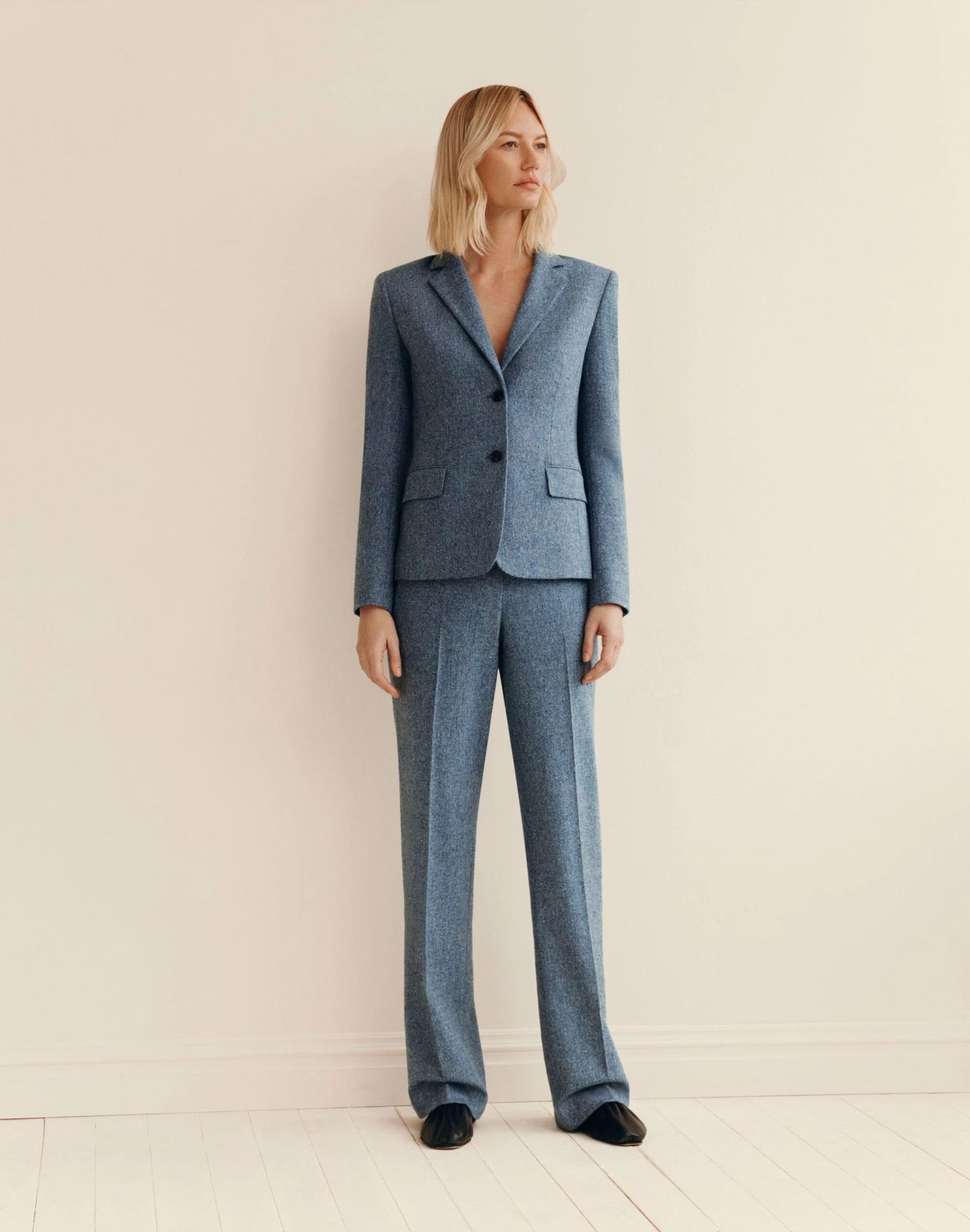 This double-button blazer is crafted from soft yet structured Italian Donegal tweed, flecked with subtle pops of color. Tailored to a slim fit with precise darting, it’s finished with a felted undercollar, flap pockets and buttoned cuff vents.