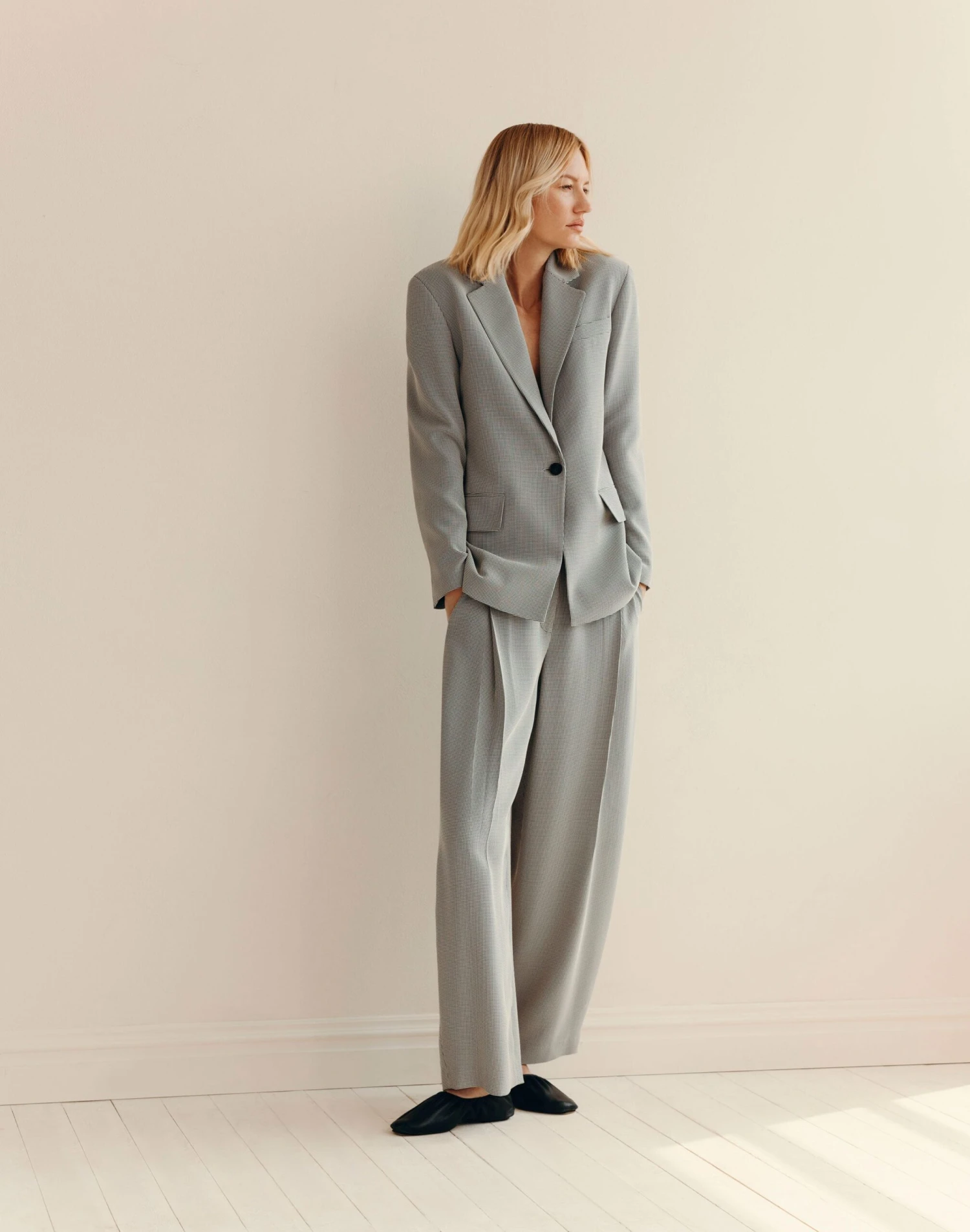 Traditional menswear tailoring is transformed in this single-button blazer, crafted from lightweight, liquid-like Italian houndstooth jacquard with fluid drape. Its fitted design is framed by lightly structured drop shoulders and finished with a chest welt and flap pockets at the hips.