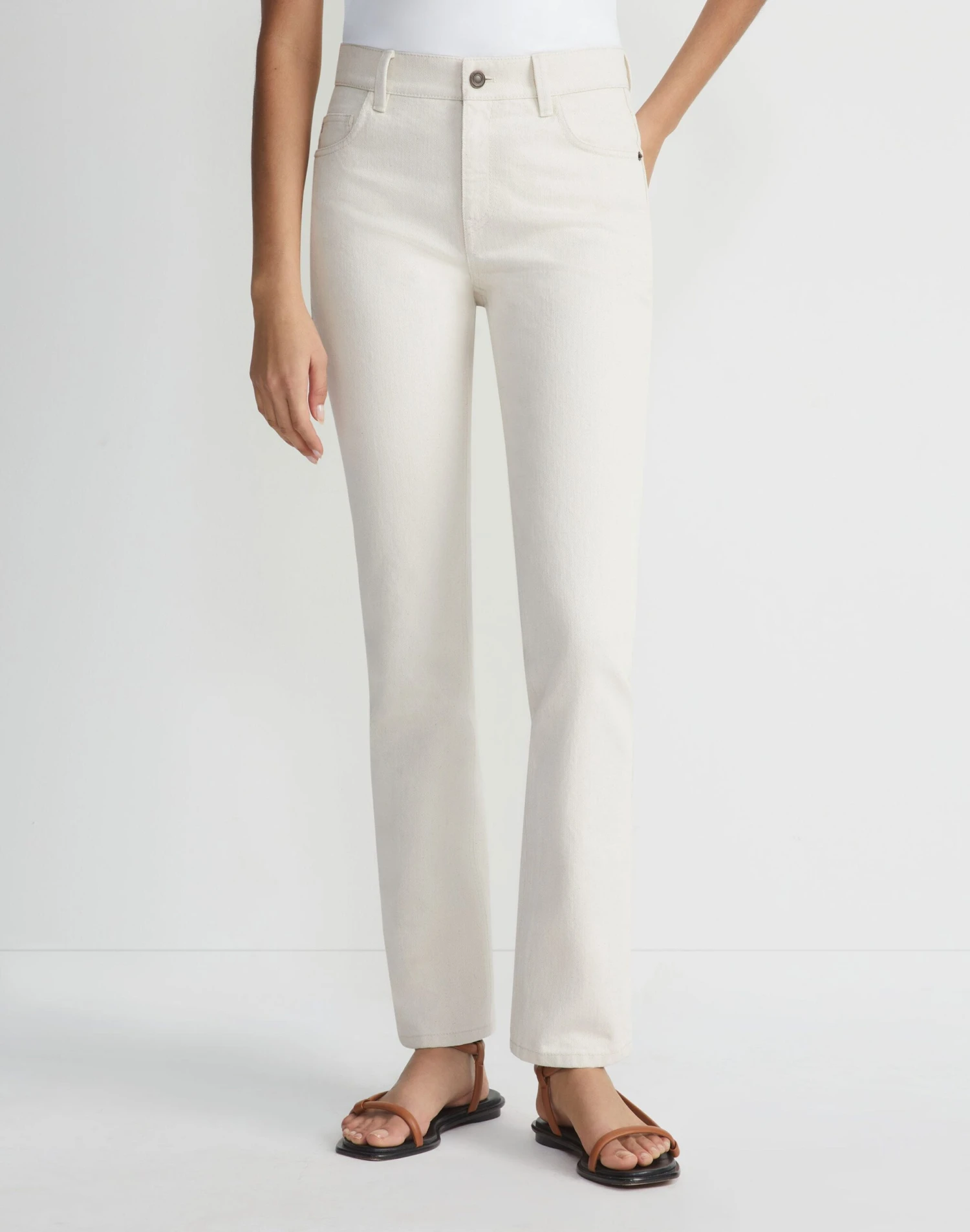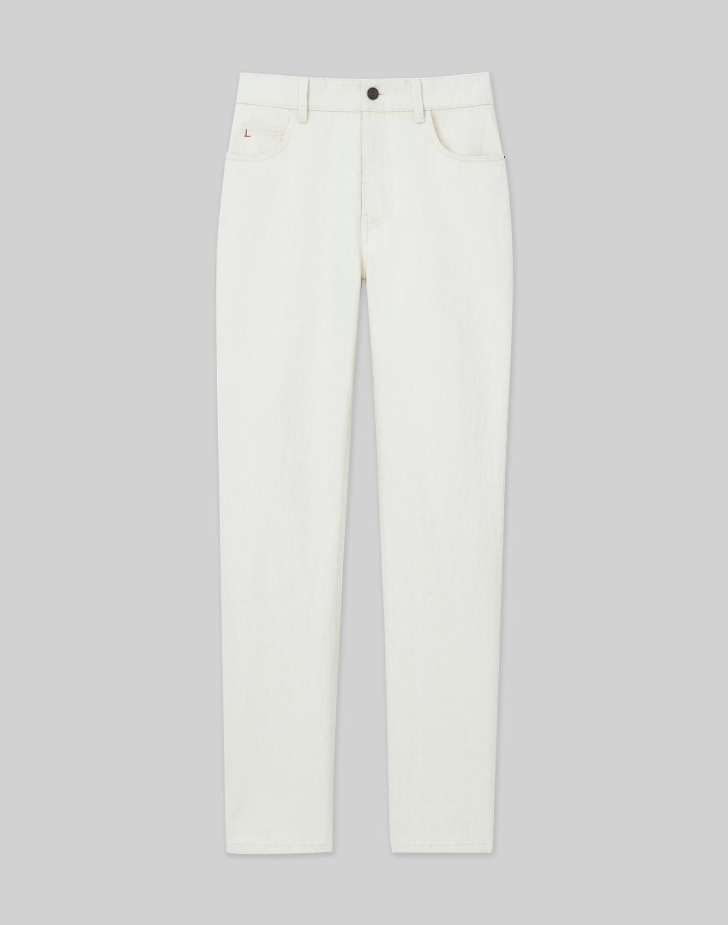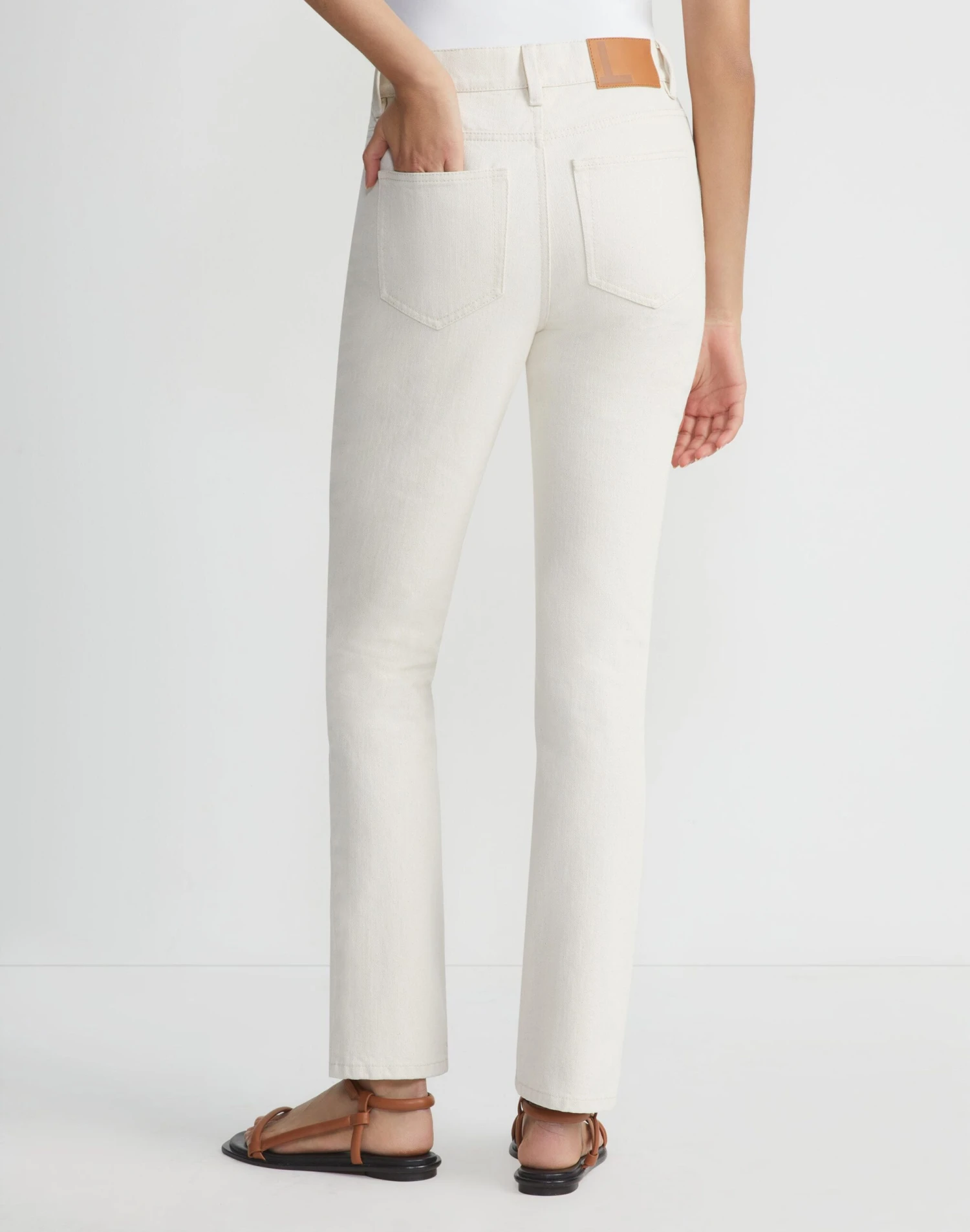 L148’s signature Reeve jean is cut with a waist-defining high rise and slim straight-leg with tapered ankle hems. Each pair is crafted utilizing traditional techniques in soft yet structured, pure cotton denim—sourced from a celebrated, sustainability-minded mill—and finished in a new natural-tone wash.