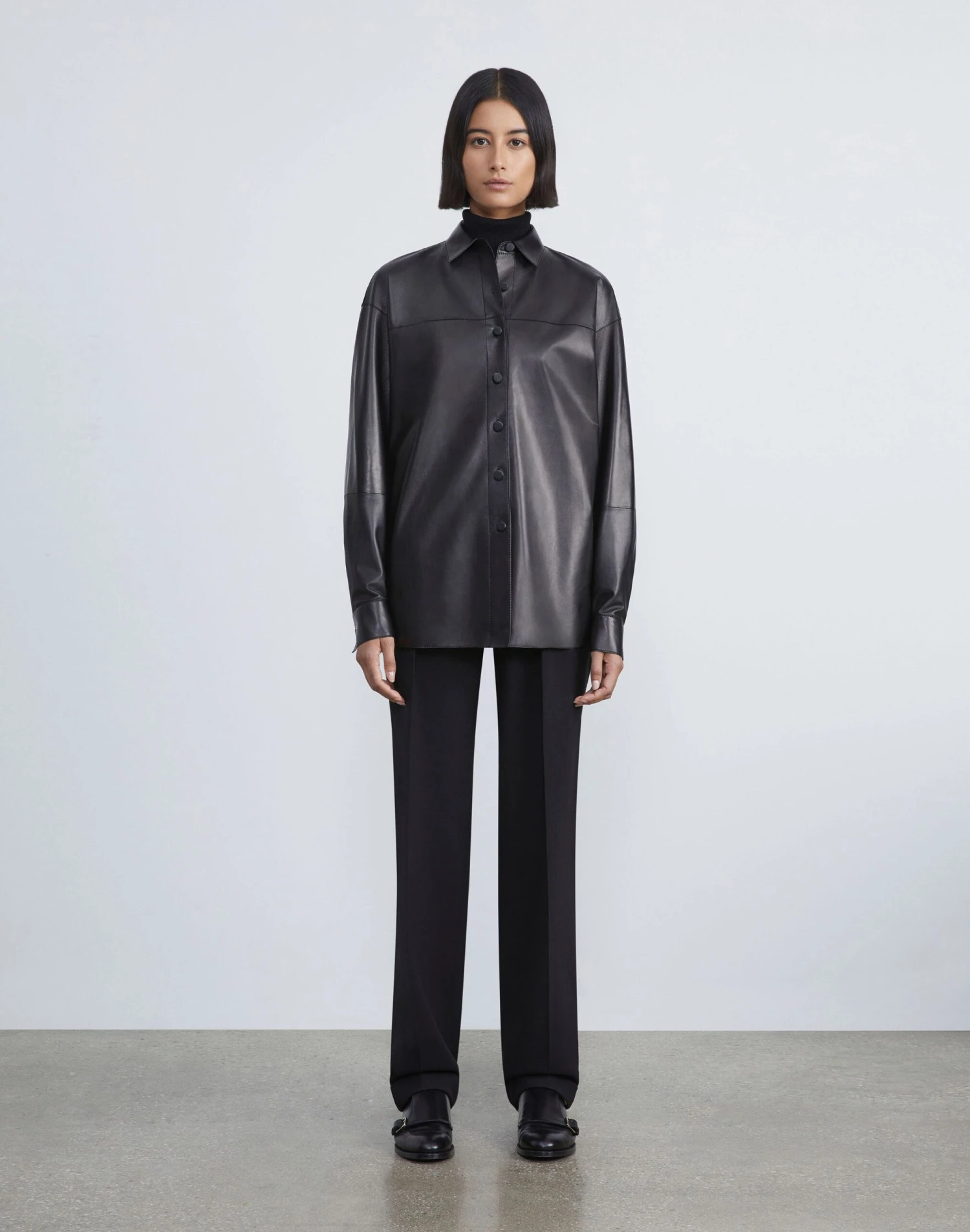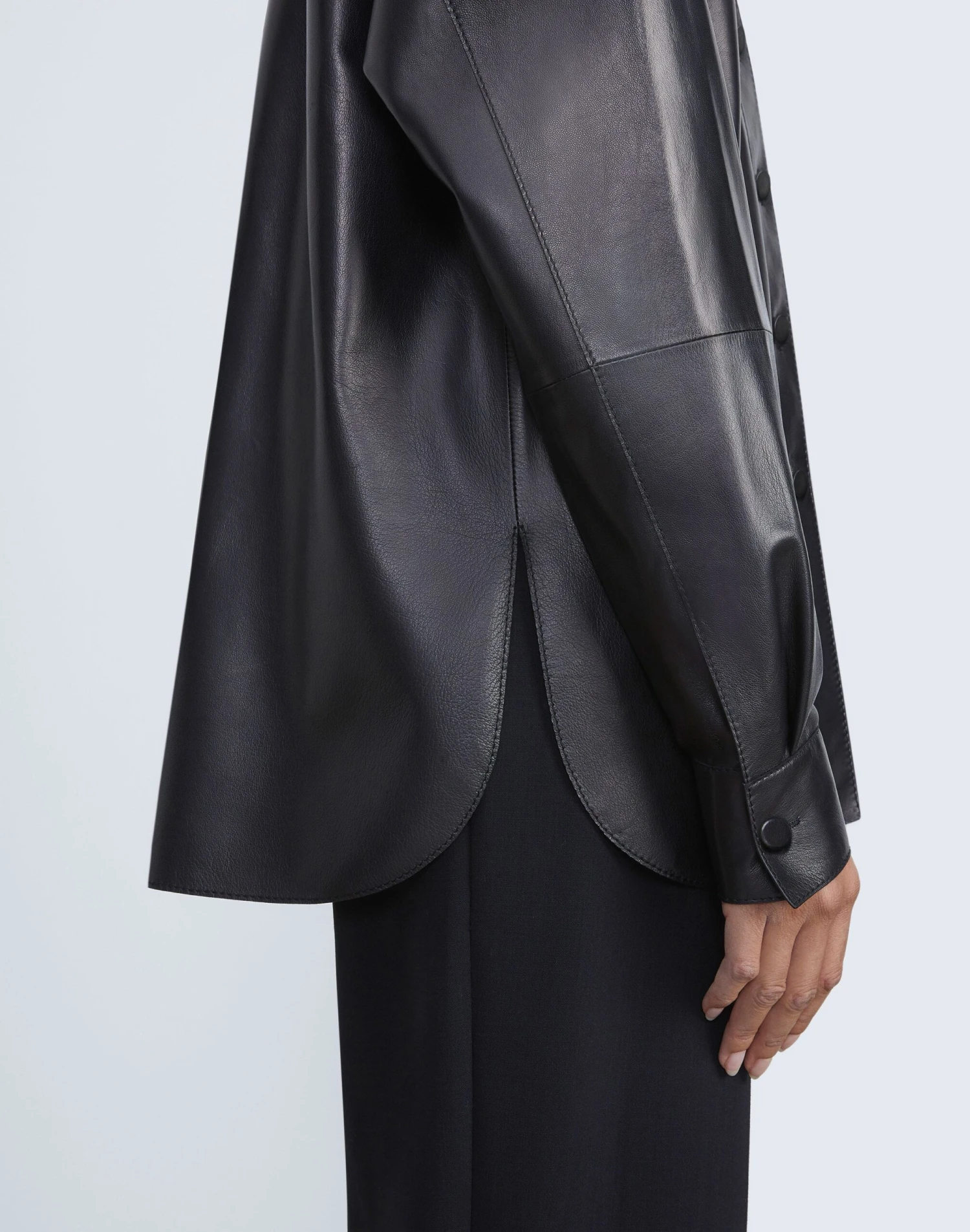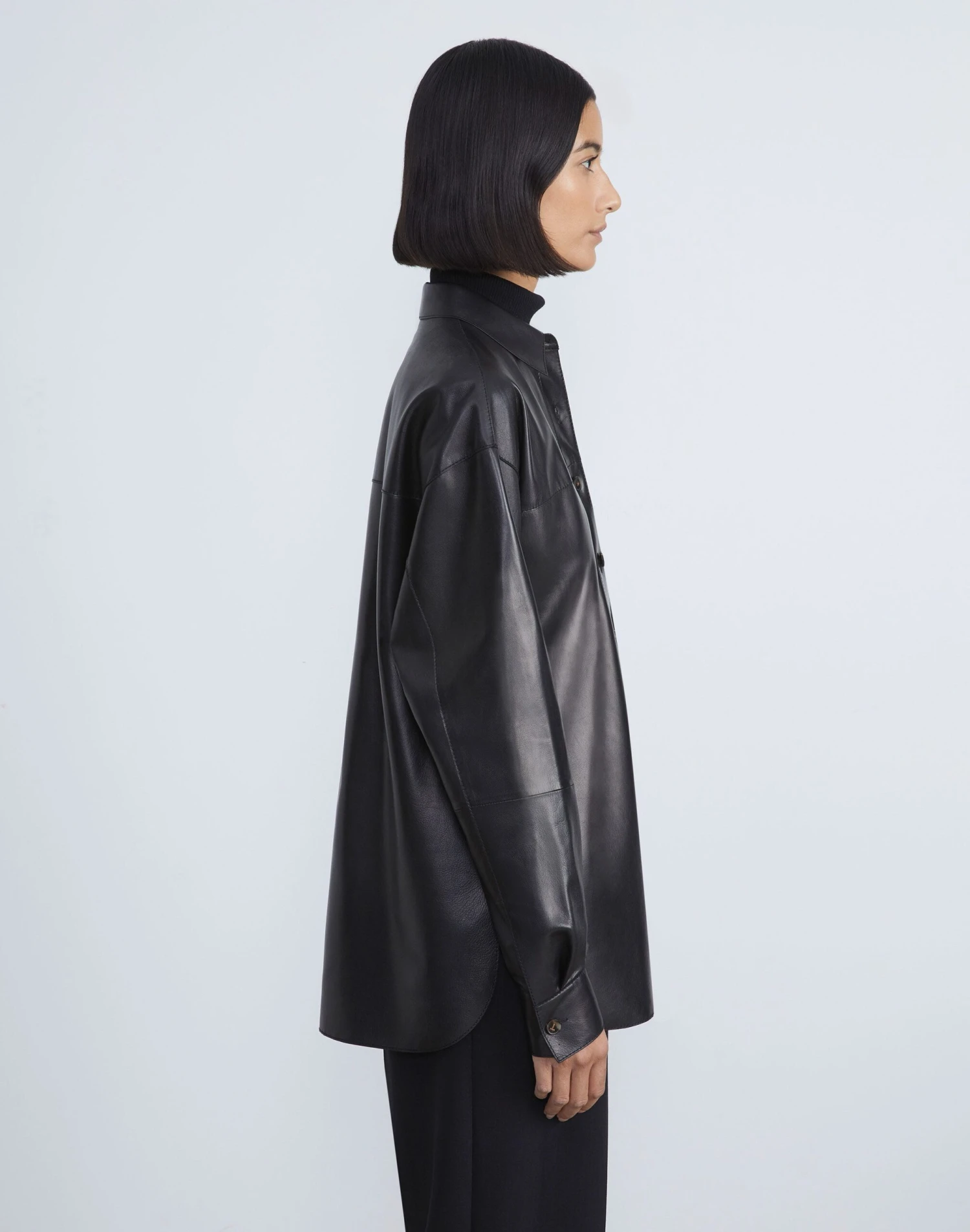 A Classic 148 signature design, the leather shirt jacket impeccably tailored from supremely soft and light, Italian nappa lambskin. The relaxed, straight cut is finished with hand-painted edges and covered buttons closures lending bespoke polish.