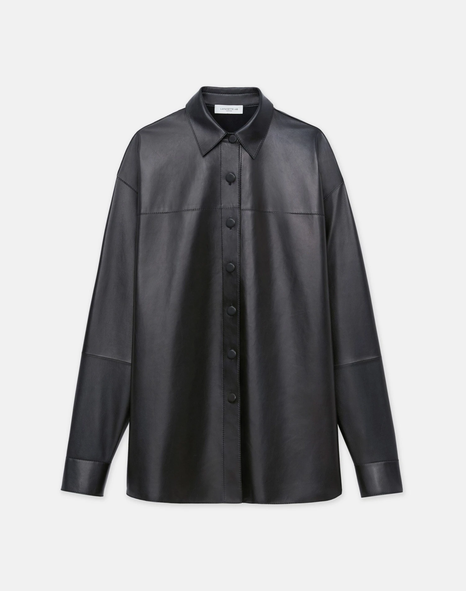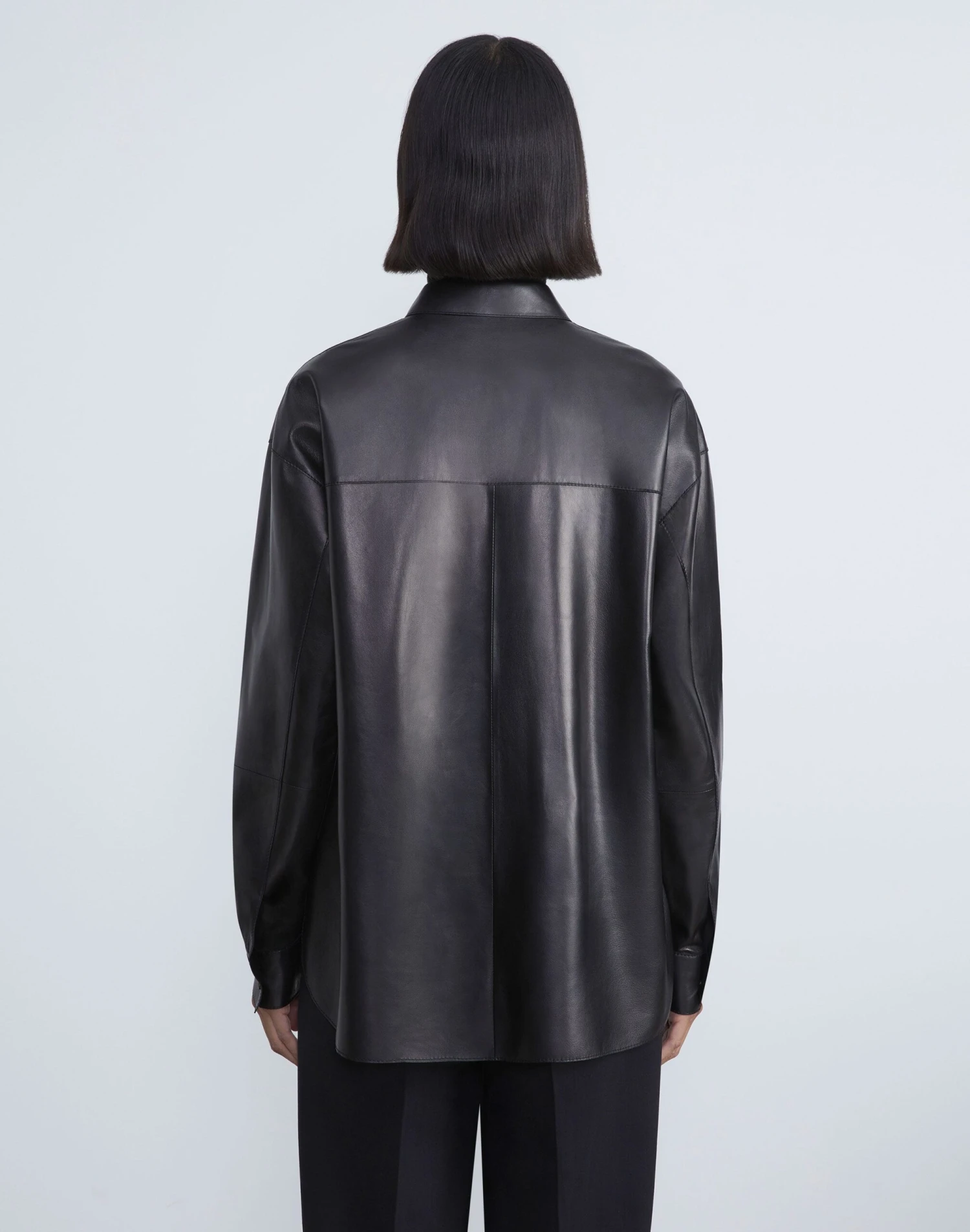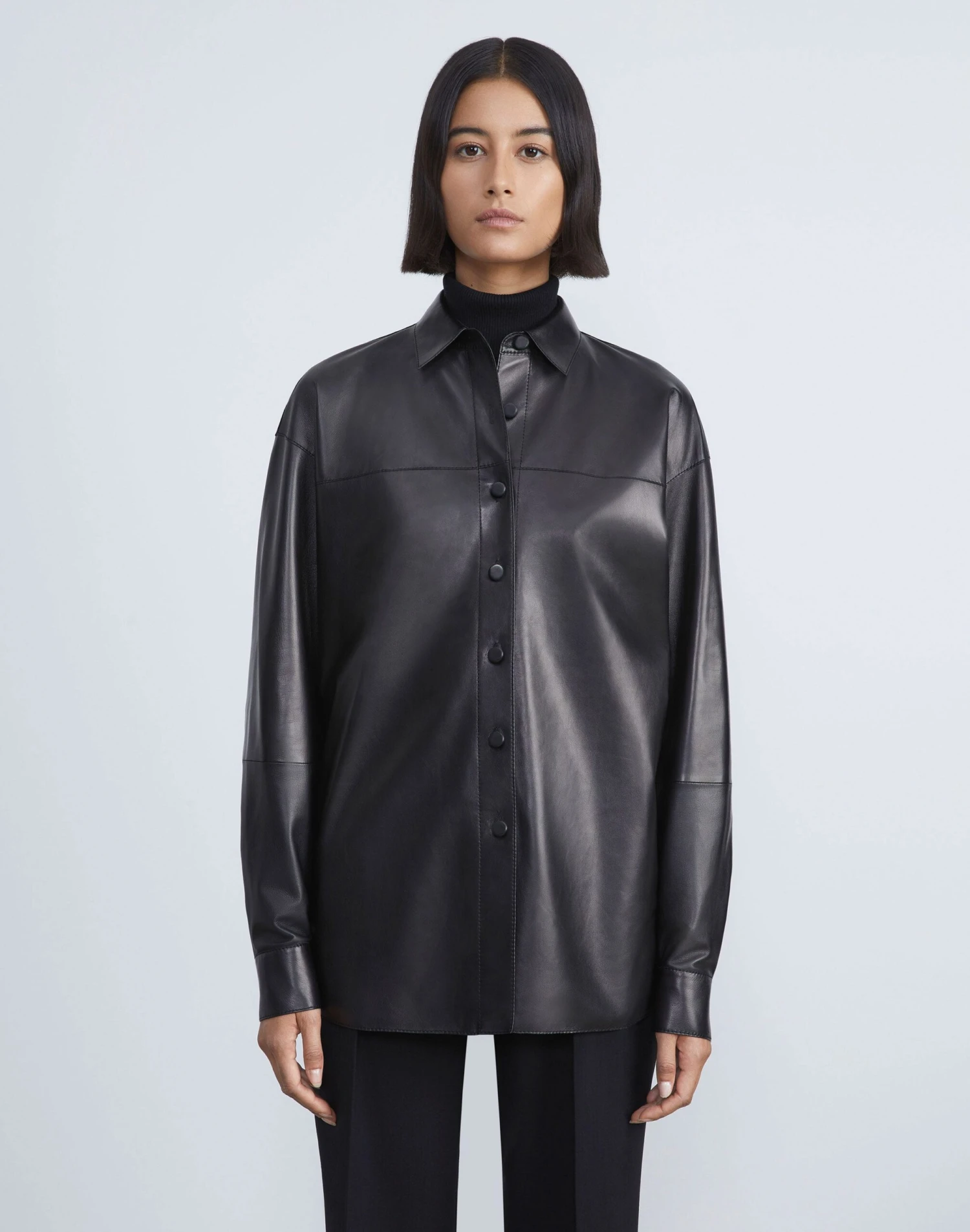 A Classic 148 signature design, the leather shirt jacket impeccably tailored from supremely soft and light, Italian nappa lambskin. The relaxed, straight cut is finished with hand-painted edges and covered buttons closures lending bespoke polish.