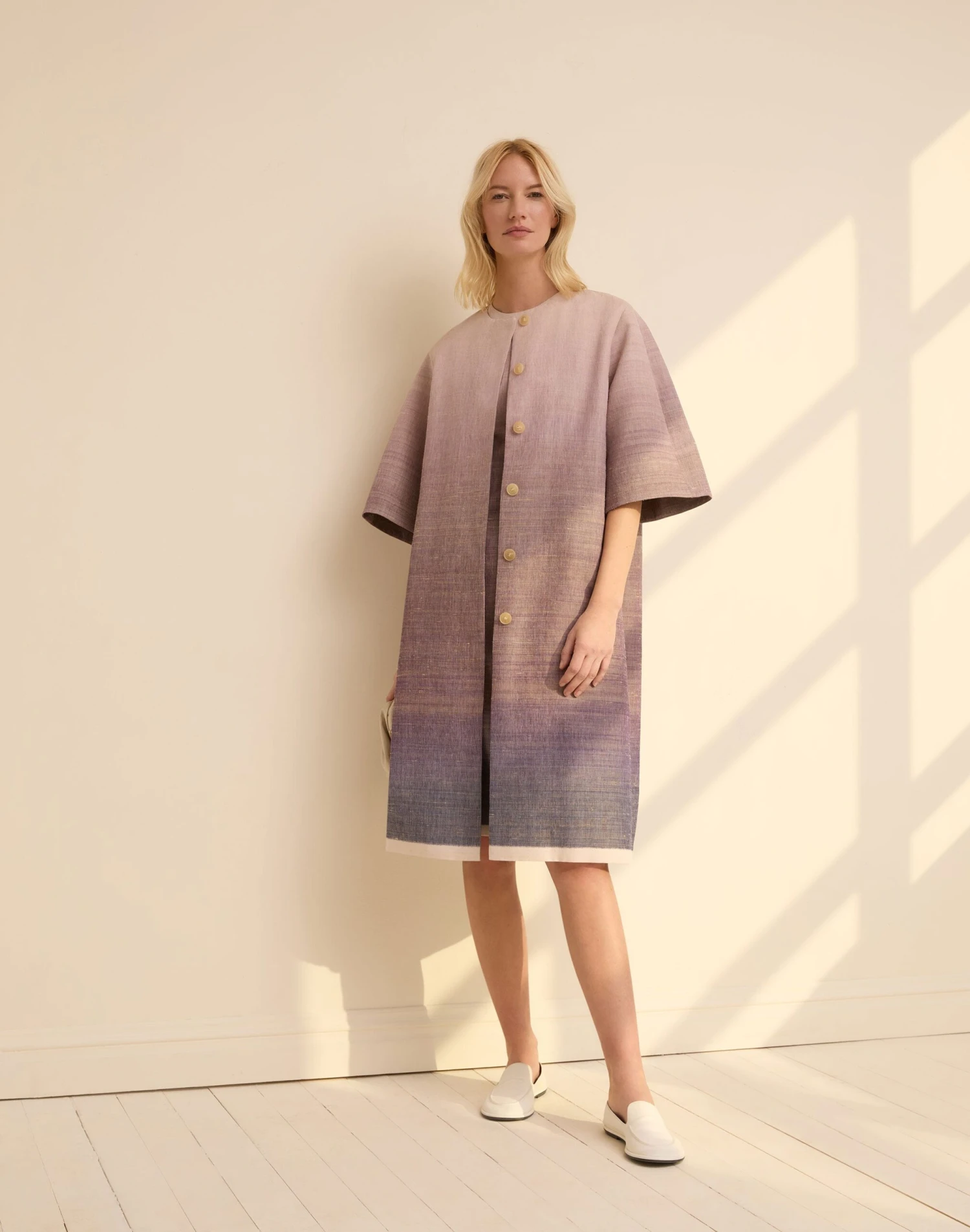 This collarless coat is tailored from a specially developed Italian ombré fabric, woven with printed Tussah silk and blended yarns. The A-line shape falls below the knee, finished with seam pockets and a concealed button closure.