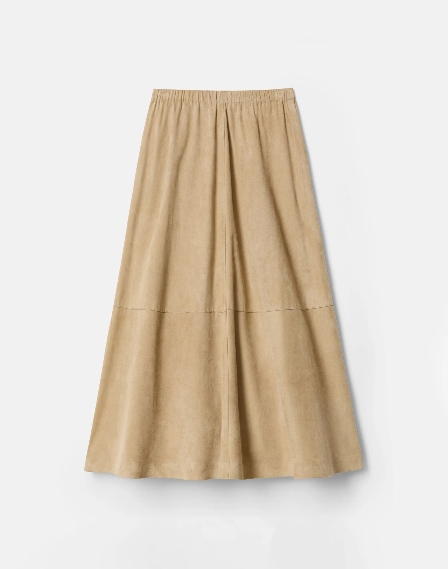 Crafted in lightweight Italian paperfine suede, this midi skirt is masterfully detailed with tonal topstitching and hand-painted edges. It’s cut to a mid-rise waist with a flared finish. Pair it with the coordinating shirt.