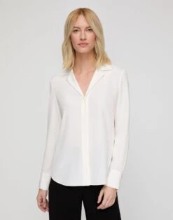 Metal buttons line the sleeves of this bateau neck blouse, opening to the elbow for an effortless, flowy effect. Designed with a minimalist straight silhouette, it’s cut from responsible Finesse Crepe—a signature seasonless fabric prized for its lightweight feel and refined drape.