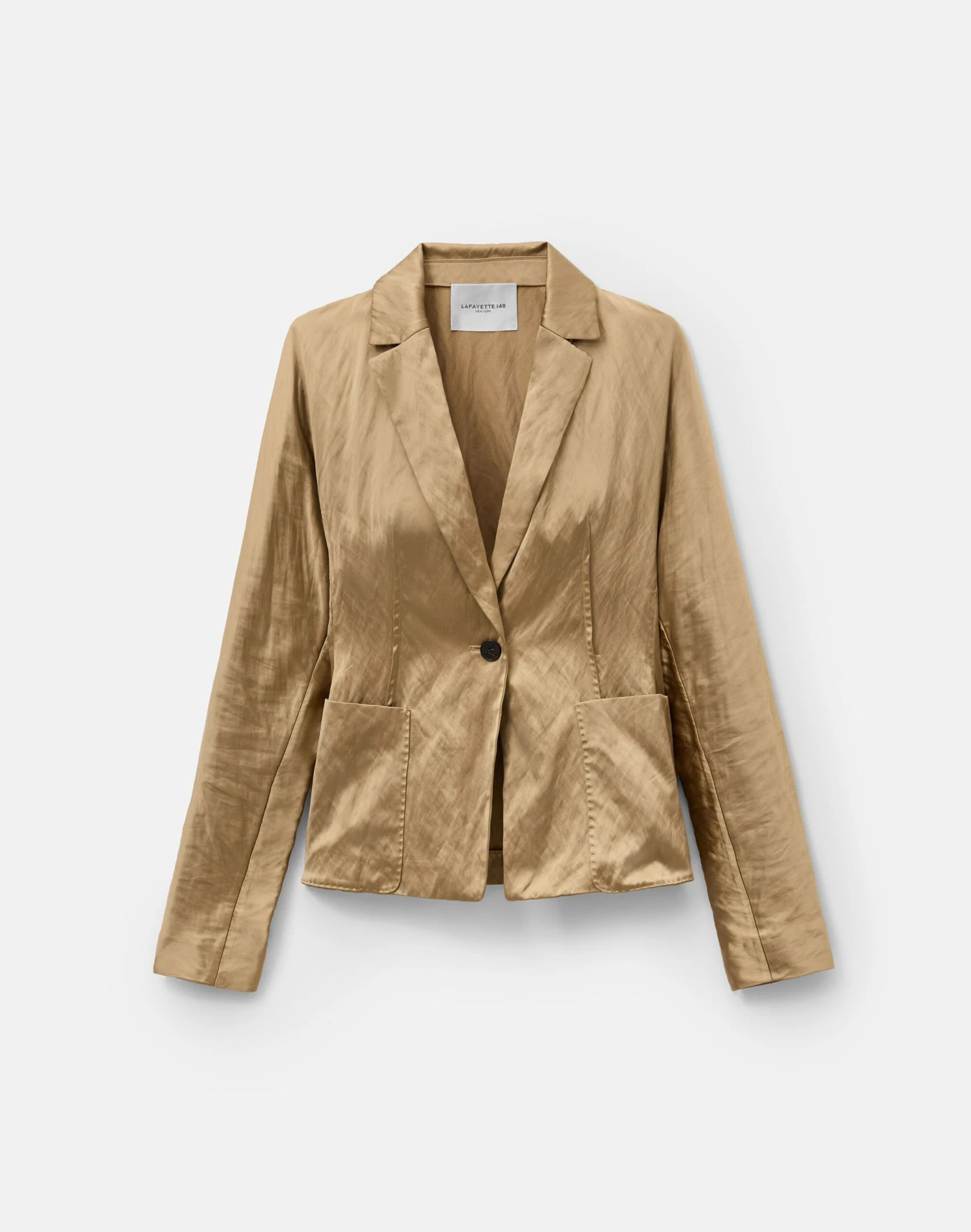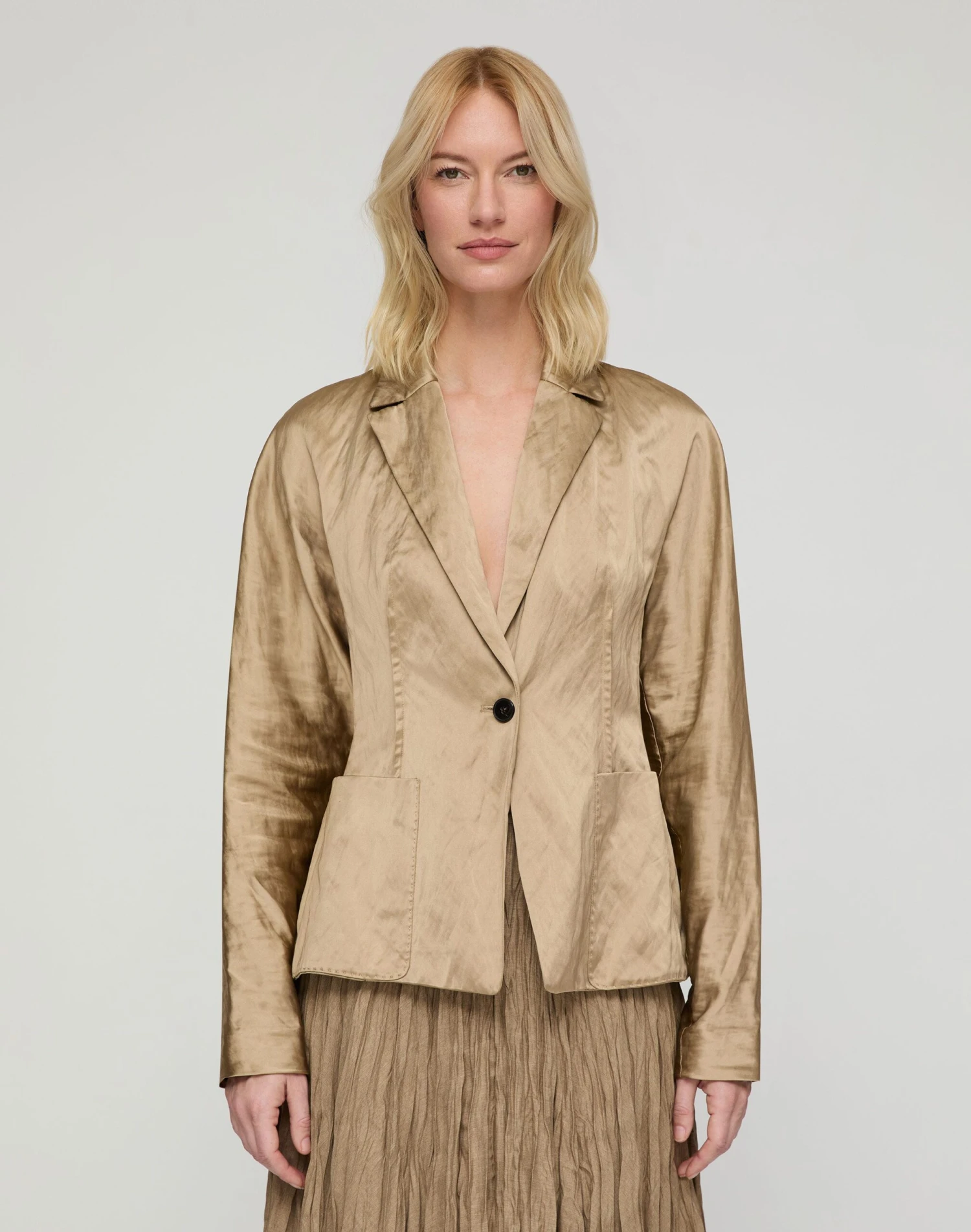 This single-button blazer features a sculptural pintucked back that tapers at the waist, creating a soft peplum effect. It’s tailored from a metallized satin weave with a lustrous sheen and lightly crinkled hand.